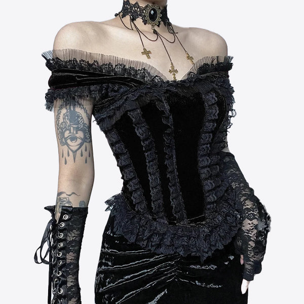 Blusa de terciopelo con hombros descubiertos : Añade un toque de lujo a tu guardarropa con esta blusa de terciopelo con hombros descubiertos. Su suave terciopelo y su elegante corte enfatizan la feminidad, creando un look sensual y sofisticado. Consulta también otras blusas góticas disponibles en nuestra tienda.
